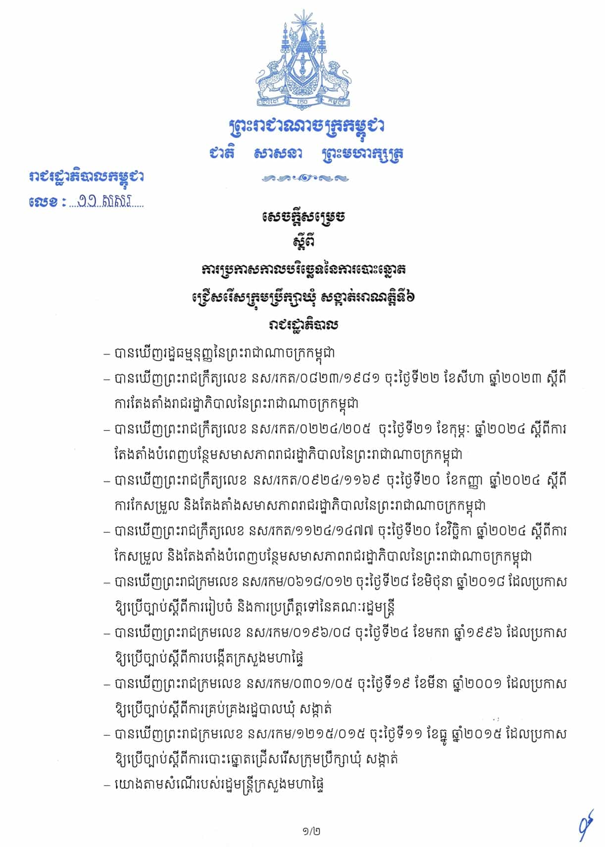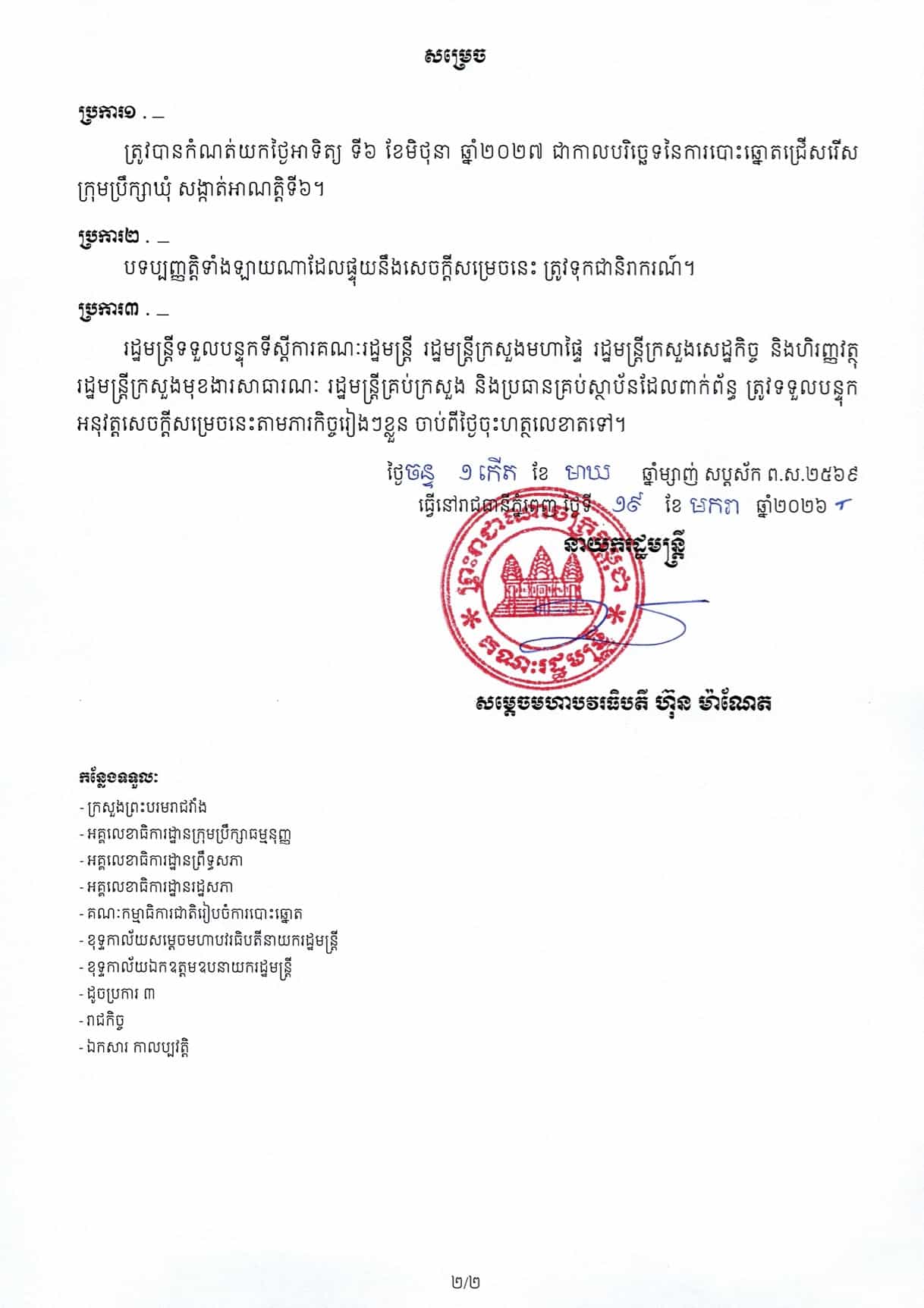 រាជរដ្ឋាភិបាលបានកំណត់យកថ្ងៃអាទិត្យទី៦ ខែ មិថុនា ឆ្នាំ ២០២៧ ជាកាលបរិចេ្ឆទនៃការបោះឆ្នោតជ្រើសរើសក្រុមប្រឹក្សាឃុំ សង្កាត់ អាណត្តិទី៦។