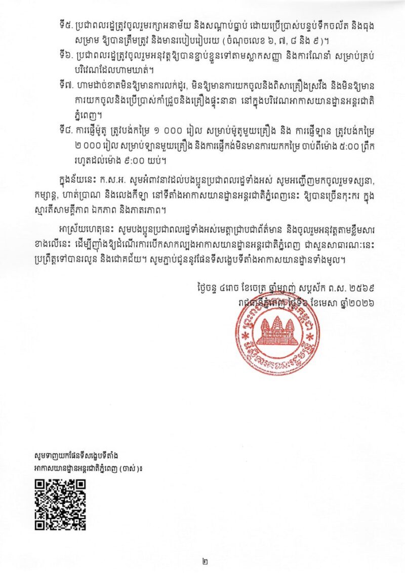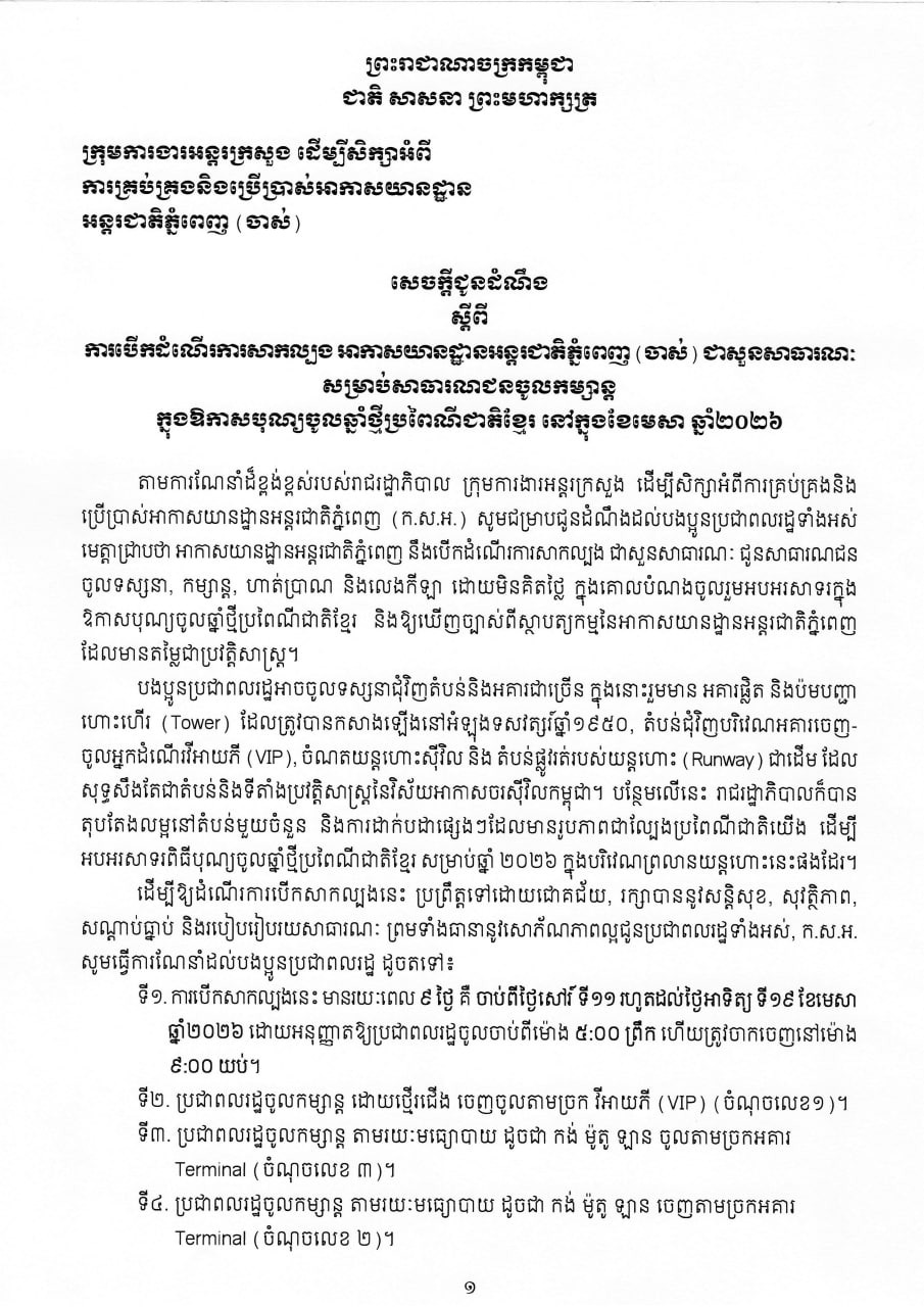 ក្រុមការងារអន្តរក្រសួងដើម្បីសិក្សាអំពីការគ្រប់គ្រងនិងប្រើប្រាស់ អាកាសយានដ្ឋានអន្តរជាតិភ្នំពេញ (ចាស់) បានចេញសេចក្តីជូនដំណឹងស្តីពីការបើកដំណើរការសាកល្បង អាកាសយានដ្ឋានអន្តរជាតិភ្នំពេញ (ចាស់)ជាសួនសាធារណៈសម្រាប់សាធារណជនចូលកម្សាន្ត ក្នុងឱកាសបុណ្យចូលឆ្នាំថ្មីប្រពៃណីជាតិខ្មែរនៅក្នុងខែមេសា ឆ្នាំ២០២៦
