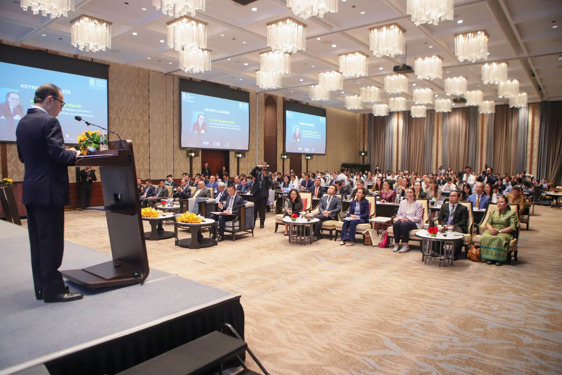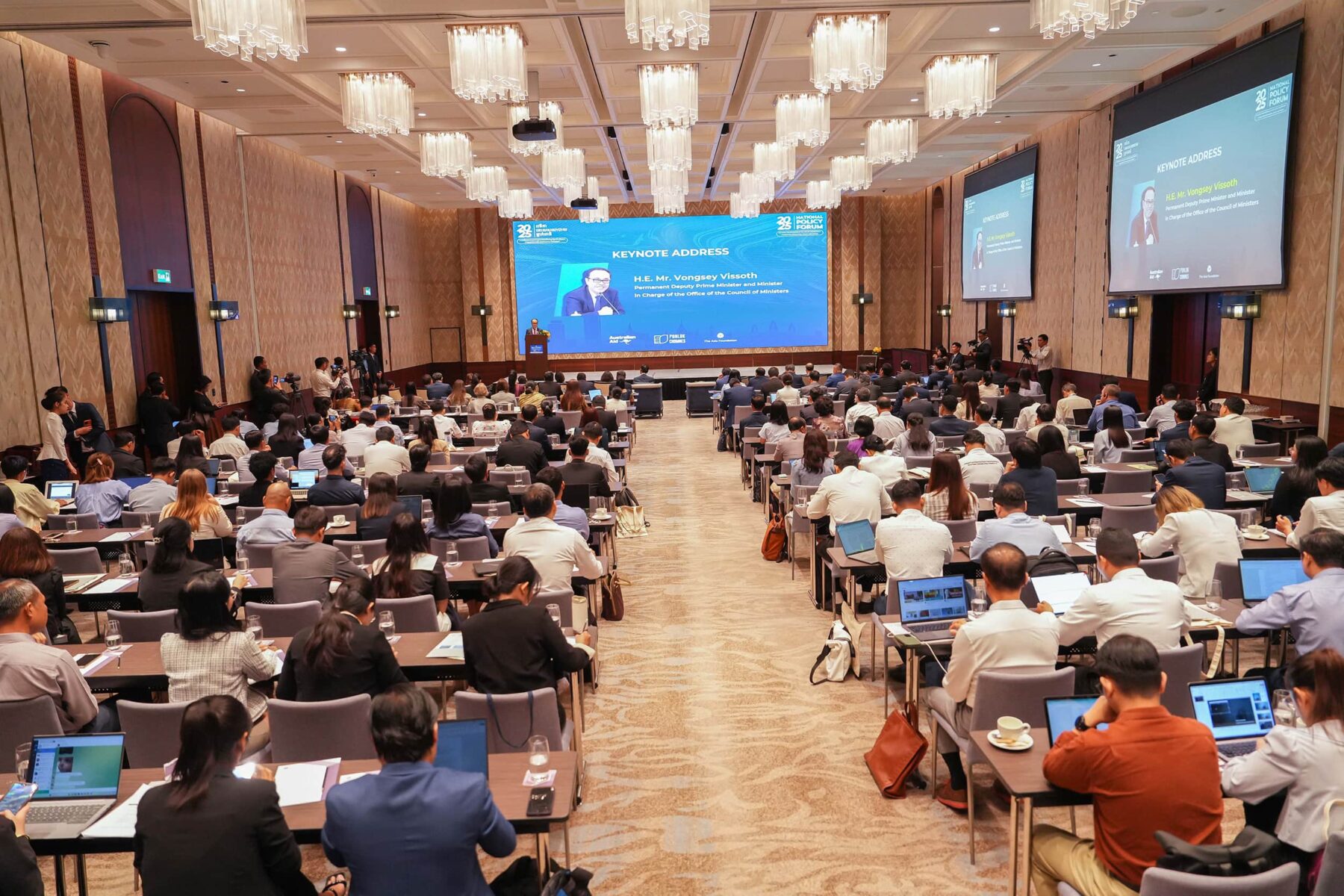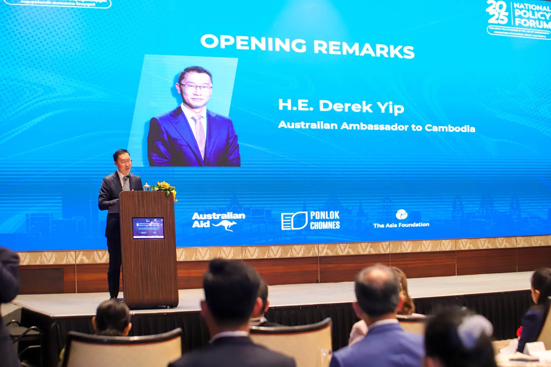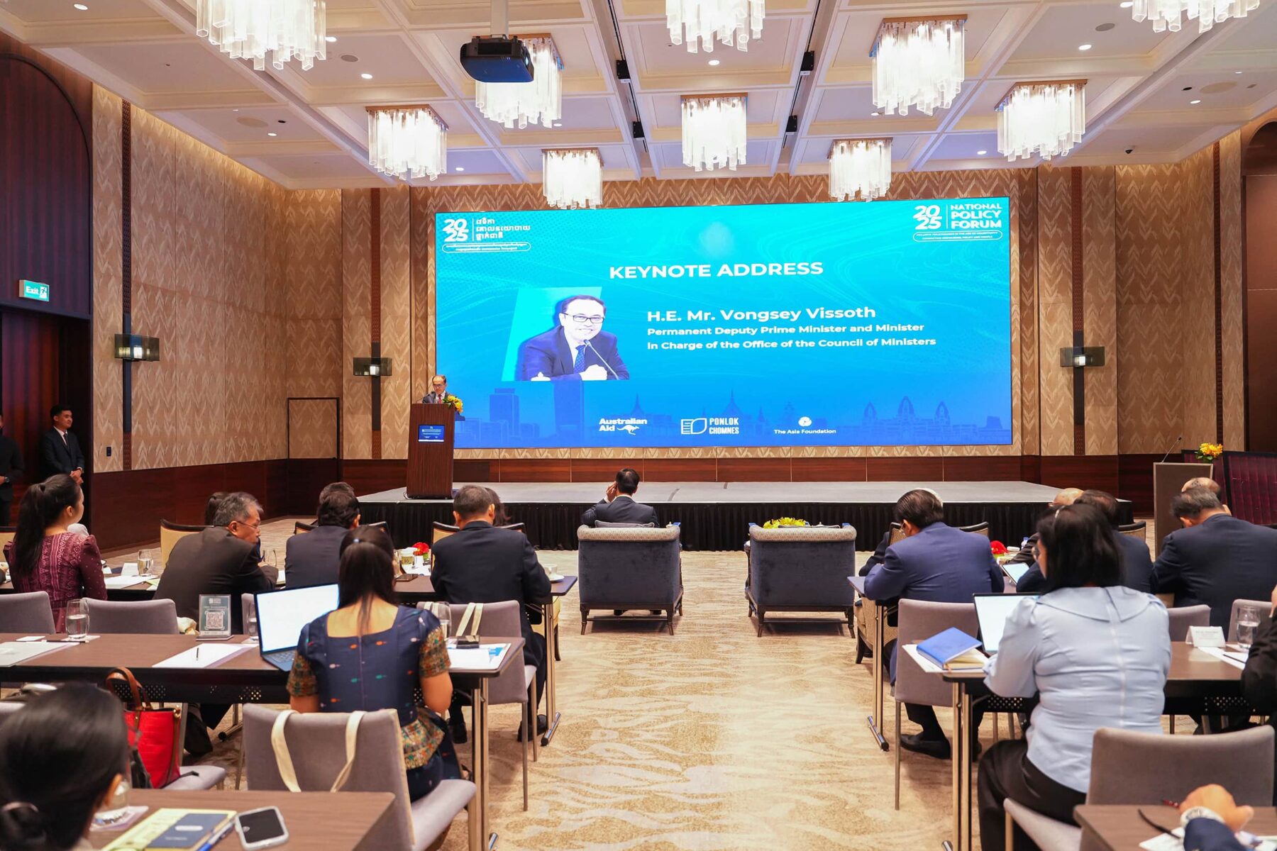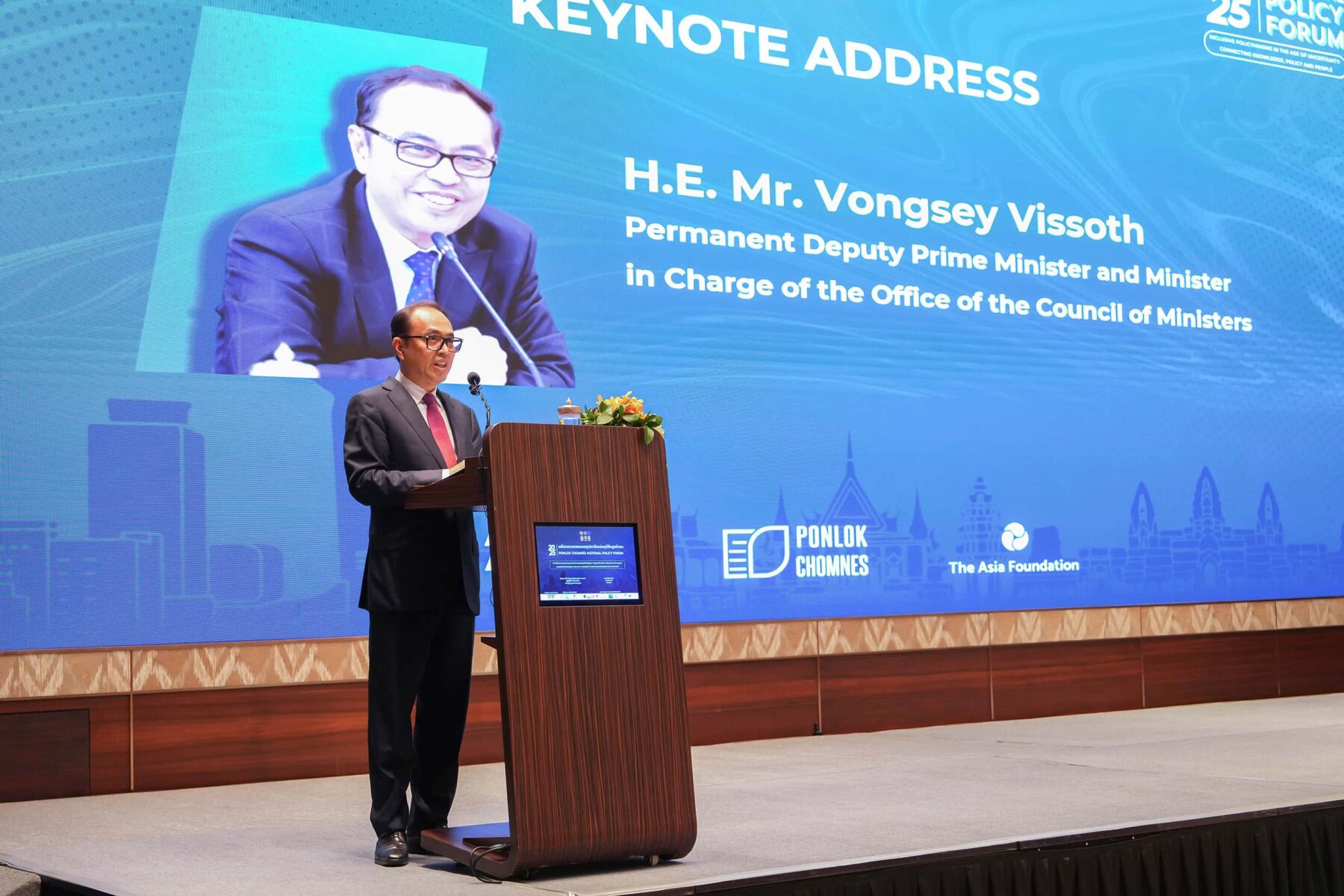 (ភ្នំពេញ)៖ នៅព្រឹកថ្ងៃទី៥ ខែកញ្ញា ឆ្នាំ២០២៥ ឯកឧត្តម វង្សី វិស្សុត ឧបនាយករដ្ឋមន្ត្រីប្រចាំការ រដ្ឋមន្ត្រីទទួលបន្ទុកទីស្តីការគណៈរដ្ឋមន្ត្រី អញ្ជើញថ្លែងសុន្ទរកថាគន្លឹះក្នុងវេទិកាគោលនយោបាយថ្នាក់ជាតិ ឆ្នាំ២០២៥ កម្មវិធីពន្លកចំណេះ ក្រោមប្រធានបទ «ការរៀបចំគោលនយោបាយប្រកបដោយបរិយាបន្ន នៅយុគសម័យមិនប្រាកដប្រជា៖ ការផ្សារភ្ជាប់ចំណេះនឹងគោលនយោបាយ និងប្រជាជន» ដែលសហការរៀបចំដោយ Australian AID, កម្មវិធីពន្លកចំណេះ និងអង្គការមូលនិធិអាស៊ី (Asia Foundation) នៅសណ្ឋាគារ Hyatt Regency ដោយមានការអញ្ជើញចូលរួមពីសំណាក់ ឯកឧត្តម Derek Yip ឯកអគ្គរដ្ឋទូតអូស្ត្រាលីប្រចាំកម្ពុជា និងតំណាងក្រសួង ស្ថាប័ន ដៃគូអភិវឌ្ឍ វិស័យឯកជន វិទ្យាស្ថានស្រាវជ្រាវ អង្គការសង្គមស៊ីវិល។