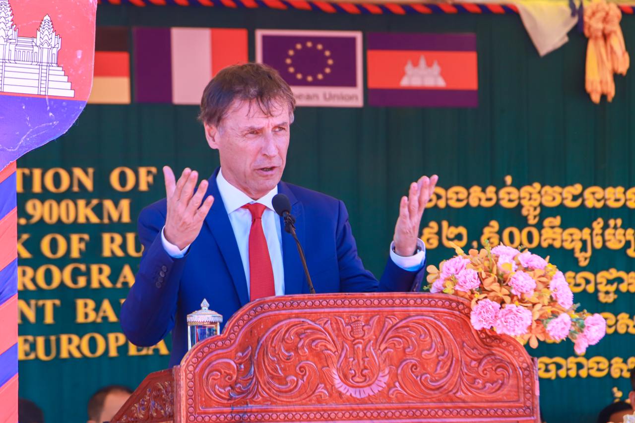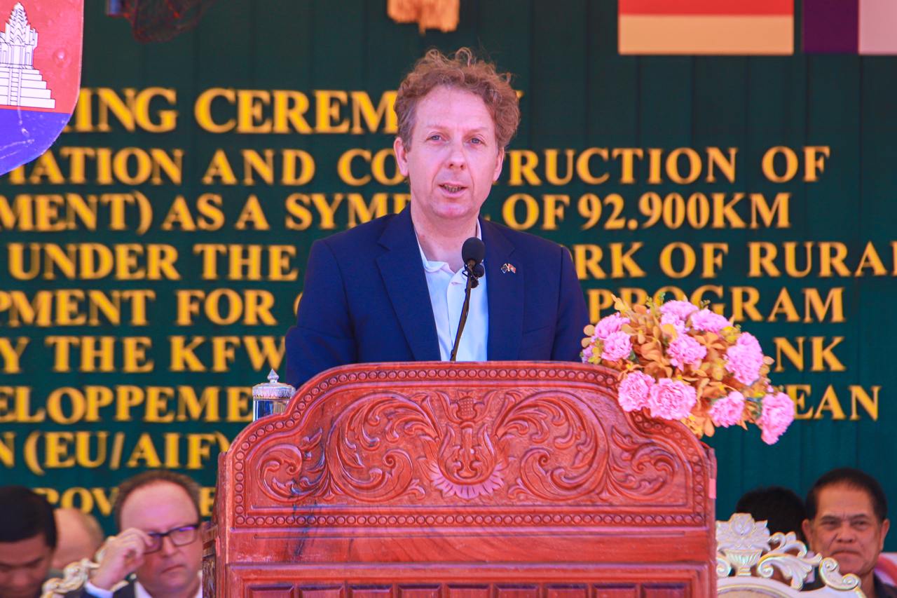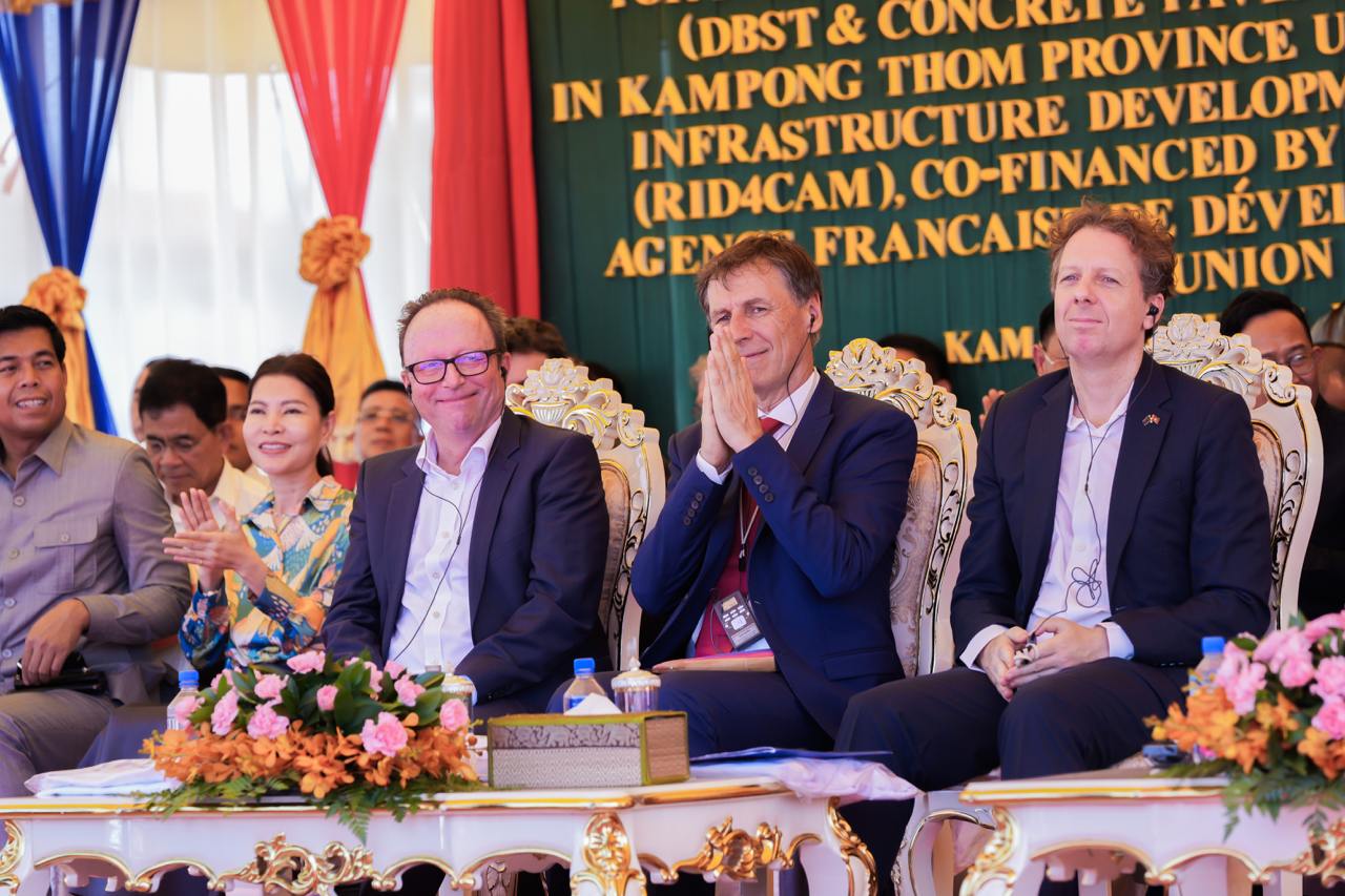 ក្នុងឱកាសនេះដែរ ឯកឧត្តម Igor DRIESMANS ឯកអគ្គរដ្ឋទូតសហភាពអឺរ៉ុប បានវាយតម្លៃខ្ពស់ ចំពោះភាពជាដៃគូដ៏រឹងមាំនិងកិច្ចសហការជិតស្និទ្ធរវាងសហភាពអឺរ៉ុបជាមួយរាជរដ្ឋាភិបាលកម្ពុជា ក្រោមគំនិត ផ្ដួចផ្ដើមរបស់សហគមន៍អឺរ៉ុប និងរដ្ឋជាសមាជិកអឺរ៉ុប ជាពិសេសប្រទេសបារាំង និងប្រទេសអាល្លឺម៉ង់ ក្នុងកិច្ចខិតខំប្រឹងប្រែងរួមគ្នា ជំរុញការលើកកម្ពស់សេដ្ឋកិច្ចនៅតាមទីជនបទដោះស្រាយបញ្ហាប្រឈមនៅតាមសហគមន៍ កាត់បន្ថយភាពក្រីក្រ ទប់ស្កាត់ផលប៉ះពាល់នៃការប្រែប្រួលអាកាសធាតុ លើកកម្ពស់សុខភាព និងគាំទ្រដល់ការធ្វើសមាហរណកម្មកម្ពុជាទៅក្នុងតំបន់ តាមរយៈគម្រោងហេដ្ឋារចនាសម្ព័ន្ធដឹកជញ្ជូន។ ឯកឧត្តម Jacques PELLET ឯកអគ្គរដ្ឋទូតបារាំង បានបន្ថែមថា គម្រោងនេះមិនមែនគ្រាន់តែជាគម្រោងសាងសង់ផ្លូវប៉ុណ្ណោះទេ ប៉ុន្តែគឺជាការវិនិយោគដ៏សំខាន់ទៅលើមនុស្ស ដោយកាត់បន្ថយភាពដាច់ឆ្ងាយនៃសហគមន៍នីមួយៗ កាត់បន្ថយពេលវេលានិងចំណាយធ្វើដំណើរ ព្រមទាំងបង្កើនលទ្ធភាពទទួលបានសេវាថែទាំសុខភាព ការអប់រំ និងឱកាសសេដ្ឋកិច្ច ដែលជាកត្តាចាំបាច់សម្រាប់ជីវភាពរបស់ប្រជាជនក្នុងមូលដ្ឋាន។ ជាមួយគ្នានេះ ឯកឧត្តម Stefan MESSERER ឯកអគ្គរដ្ឋទូតអាល្លឺម៉ង់ បានគូសរំលេចនូវសមិទ្ធផលសំខាន់ៗនៃកិច្ចសហប្រតិបតិ្តការកម្ពុជា-អាល្លឺម៉ង ដោយកន្លងមកប្រទេសអាល្លឺម៉ង់បានវិនិយោគសរុបប្រមាណ ៧៥,៥១៦លាន អឺរ៉ូ និង ៣១លាន Deutsche Mark (DM) ក្នុងការអភិវឌ្ឍហេដ្ឋារចនាសម្ព័ន្ធជនបទនៅព្រះរាជាណាចក្រកម្ពុជា។ ឯកឧត្តមឯកអគ្គរដ្ឋទូតទាំងបីរូប បានបង្ហាញនូវឆន្ទៈមោះមុតក្នុងការសហការយ៉ាងជិតស្និទ្ធជាមួយរាជរដ្ឋាភិបាលកម្ពុជា ដើម្បីបន្តគាំទ្រដល់ការអភិវឌ្ឍ និងការលើកកម្ពស់ជីវភាពរបស់ប្រជាជនកម្ពុជា។