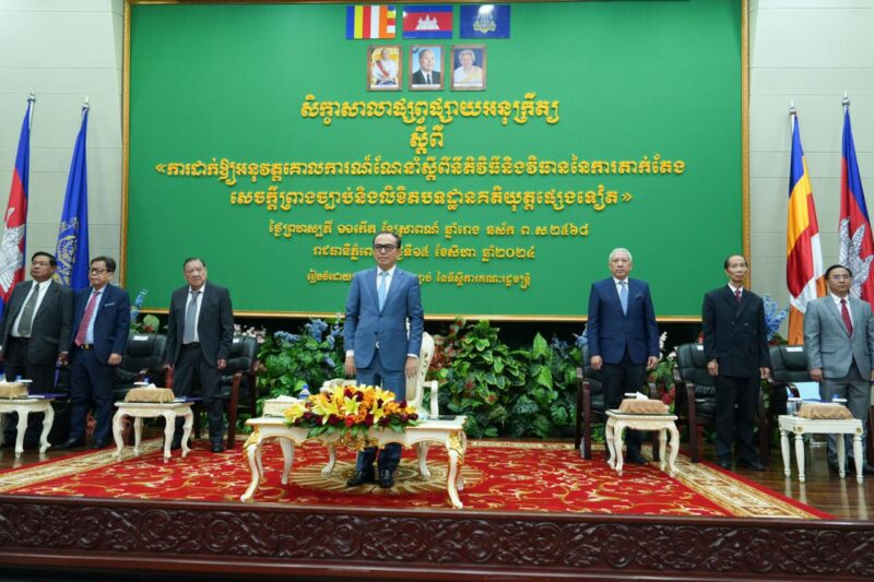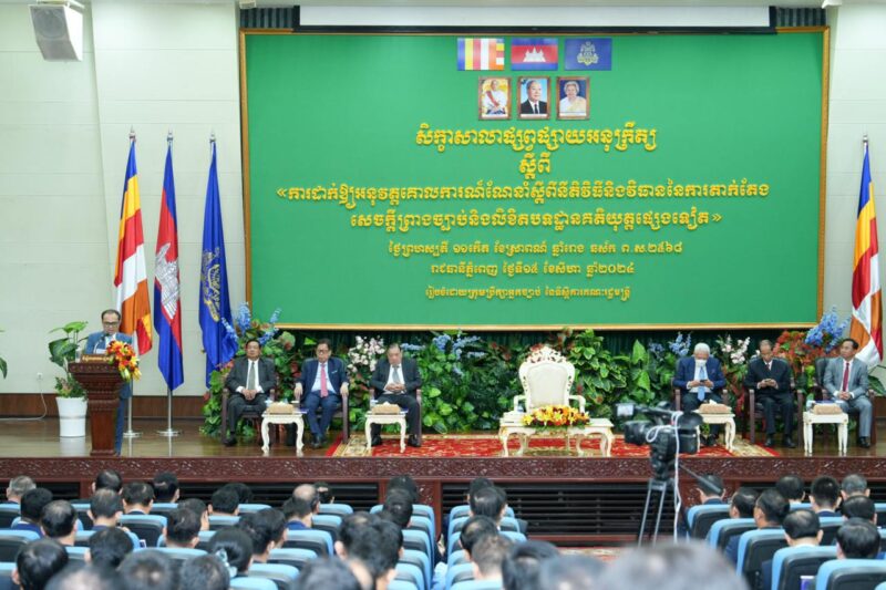 ភ្នំពេញ៖ នៅព្រឹកថ្ងៃទី ១៥ ខែ សីហា ឆ្នាំ២០២៤ ឯកឧត្ដម វង្សី វិស្សុត ឧបនាយករដ្ឋមន្ដ្រីប្រចាំការ រដ្ឋមន្ដ្រីទទួលបន្ទុកទីស្ដីការគណៈរដ្ឋមន្ដ្រីនិងជាប្រធានក្រុមប្រឹក្សាអ្នកច្បាប់បានចូលរួមធ្វើជាអធិបតីភាពក្នុងពិធីសិក្ខាសាលាផ្សព្វផ្សាយអនុក្រឹត្យស្តីពីការដាក់ឱ្យអនុវត្ដគោលការណ៍ណែនាំស្ដីពីនីតិវិធី និងវិធាននៃការតាក់តែងសេចក្ដីព្រាងច្បាប់ និងលិខិតបទដ្ឋានគតិយុត្ដផ្សេងទៀត ដែលត្រូវបានរៀបចំឡើងដោយក្រុមប្រឹក្សាអ្នកច្បាប់ នៃទីស្តីការគណៈរដ្ឋមន្ត្រី។ សិក្ខាសាលានេះដែរមានការចូលរួមដោយ ឯកឧត្ដមទេសរដ្ឋមន្ដ្រី ឯកឧត្តមរដ្ឋមន្រ្តីប្រតិភូអមនាយករដ្ឋមន្រ្តី ឯកឧត្ដម លោកជំទាវ ជាថ្នាក់ដឹកនាំទីស្ដីការគណៈរដ្ឋមន្ដ្រី និងតំណាងក្រសួងស្ថាប័ន ទីប្រឹក្សា សមាជិក-សមាជិកា នៃក្រុមប្រឹក្សាអ្នកច្បាប់-ក្រុមប្រឹក្សាសេដ្ឋកិច្ច សង្គមកិច្ច និង វប្បធម៌ និង សហភាពសហព័ន្ធយុវជនកម្ពុជាវិស័យទីស្តីការគណៈរដ្ឋមន្រ្តី រួមទាំងនិស្សិតមកពីសាកលវិទ្យាល័យនានាសរុបចំនួនប្រមាណ៤៧០នាក់ ។