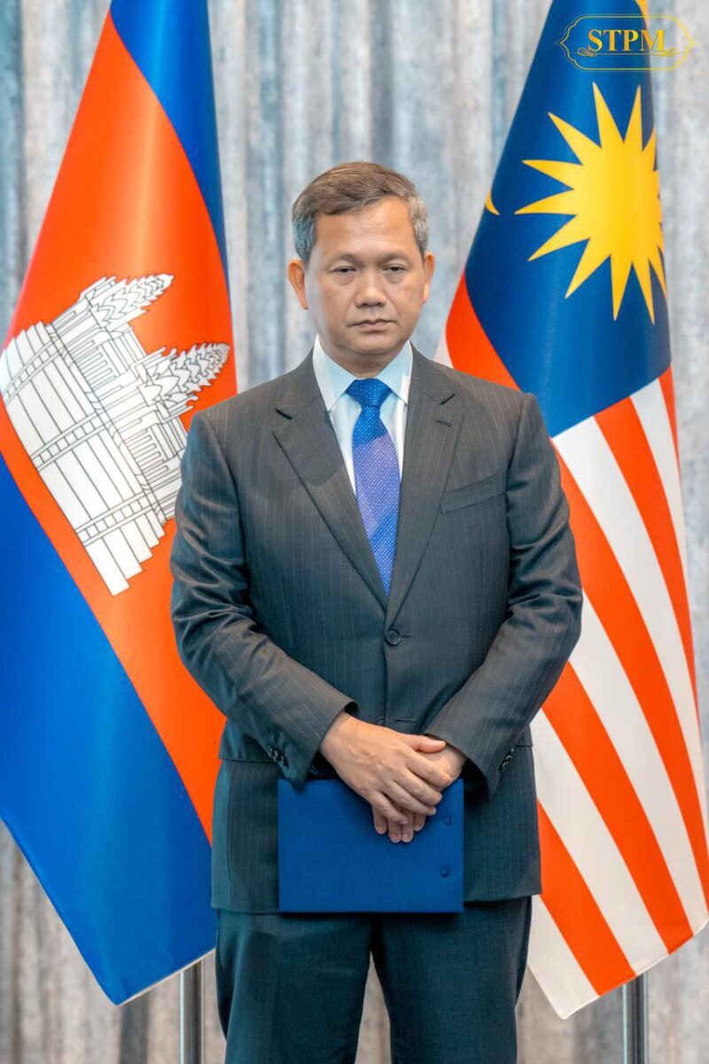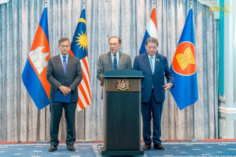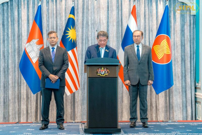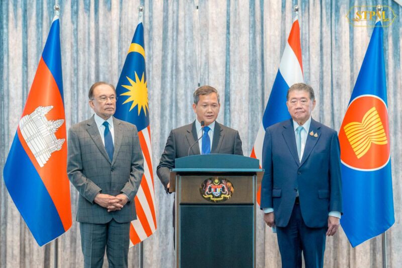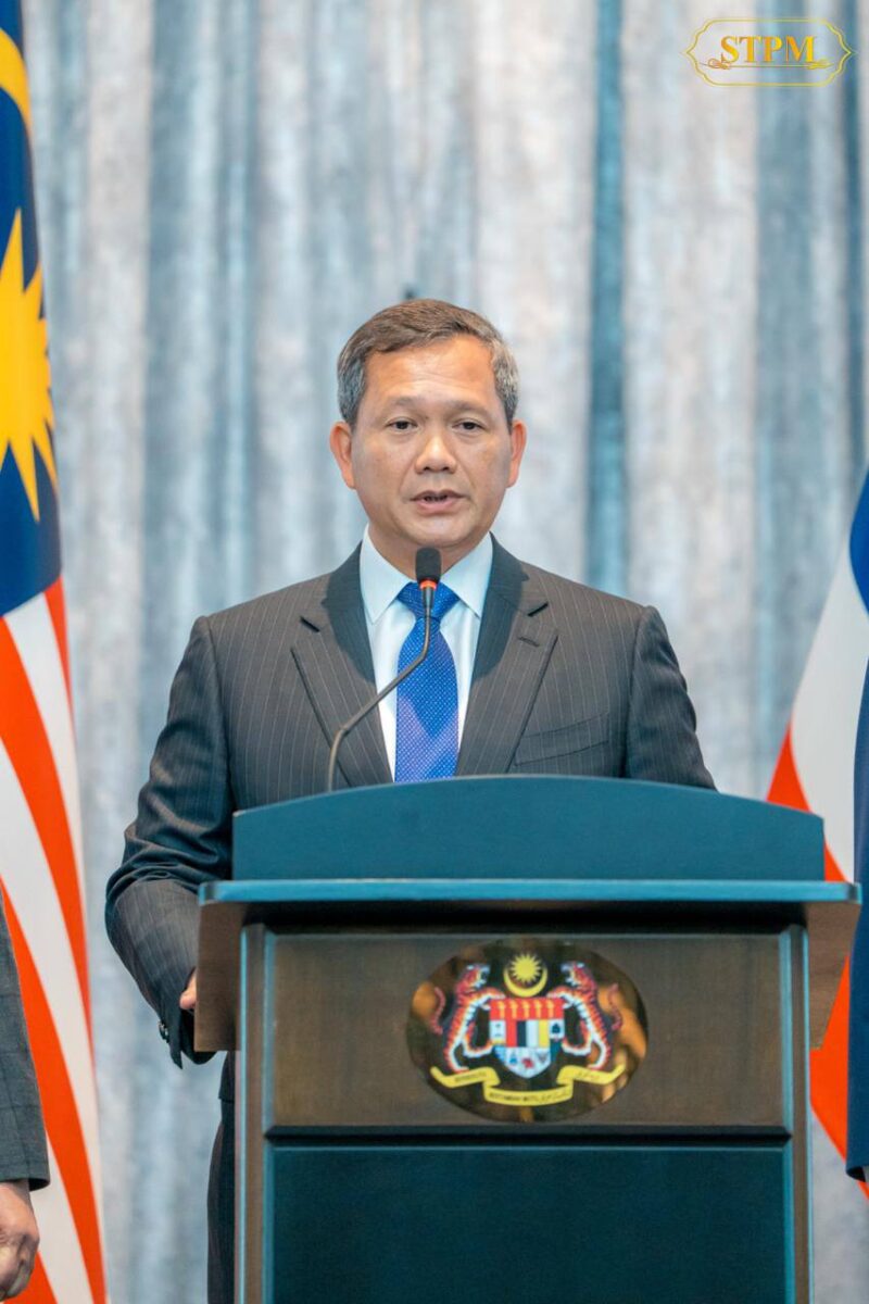 Samdech Moha Borvor Thipadei Hun Manet, Prime Minister of the Kingdom of Cambodia, participates in a press conference to highlight the positive outcomes following the conclusion of the special meeting to achieve an immediate “ceasefire,” hosted by Malaysia, co-organized by the United States, and with the participation of China’s representative.