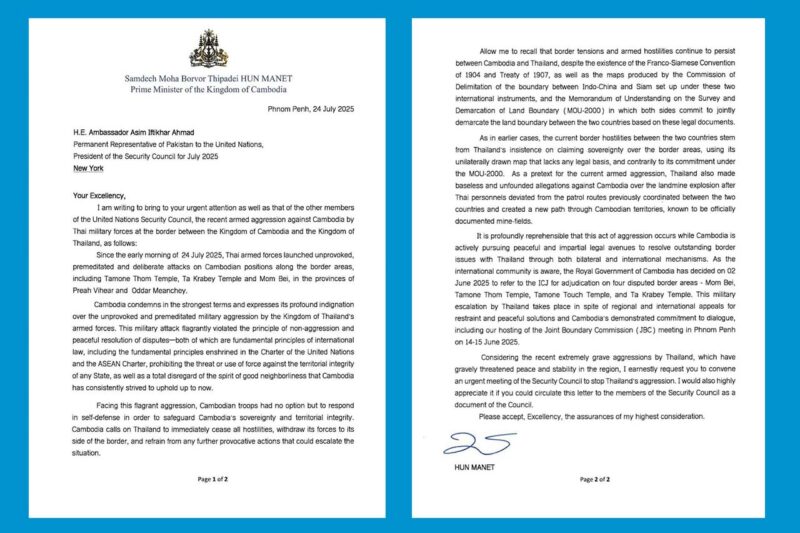 លិខិតផ្ញើជូនឯកឧត្តម Asim Iftikhar Ahmad ប្រធានប្តូរវេនក្រុមប្រឹក្សាសន្តិសុខអង្គការសហប្រជាជាតិ សម្រាប់ខែកក្កដាឆ្នាំ ២០២៥ ស្នើសុំកោះប្រជុំក្រុមប្រឹក្សាសន្តិសុខជាបន្ទាន់ ដើម្បីសុំការអន្តរាគមន៍បញ្ចប់ការឈ្លានពានរបស់កងទ័ពថៃមកលើដែនអធិបតីភាពករបស់កម្ពុជា។