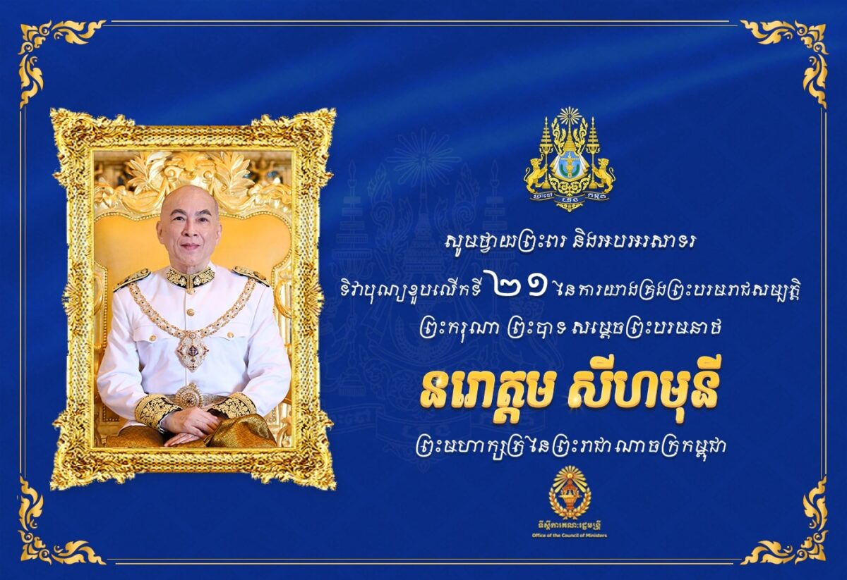 សូមថ្វាយព្រះពរ និងអបអរសាទរ ទិវាបុណ្យខួបលើកទី ២១ នៃការយាងគ្រងព្រះបរមរាជសម្បត្តិ ព្រះករុណា ព្រះបាទ សម្តេចព្រះបរមនាថ នរោត្តម សីហមុនី ព្រះមហាក្សត្រ នៃព្រះរាជាណាចក្រកម្ពុជា