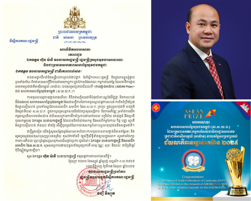 ឯកឧត្តម វង្សី វិស្សុត ឧបនាយករដ្ឋមន្ត្រីប្រចាំការ រដ្ឋមន្ត្រីទទួលបន្ទុកទីស្តីការគណៈរដ្ឋមន្រ្តី ផ្ញើសារលិខិតអបអរសាទរឯកឧត្តម ហ៊ុន ម៉ានី ឧបនាយករដ្ឋមន្ត្រី រដ្ឋមន្ត្រីក្រសួងមុខងារសាធារណៈ និងជាប្រធានសហភាពសហព័ន្ធយុវជនកម្ពុជា (សសយក) ក្នុងឱកាសទទួលបានជ័យលាភីពាន់រង្វាន់អាស៊ានឆ្នាំ២០២៥