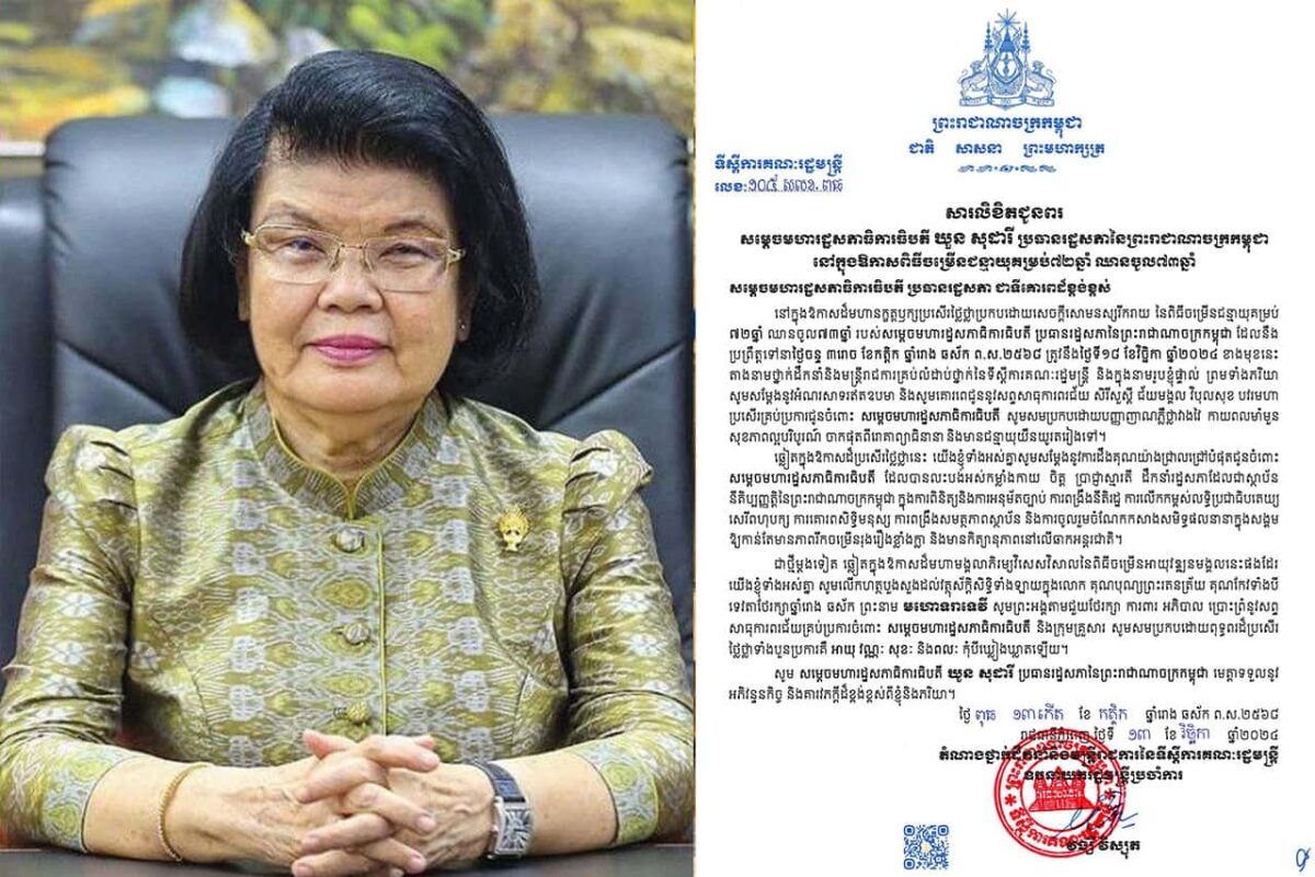 សារលិខិតជូនពរ សម្តេចមហារដ្ឋសភាធិការធិបតី ឃួន សុដារី ប្រធានរដ្ឋសភានៃព្រះរាជាណាចក្រកម្ពុជា នៅក្នុងឱកាសពិធីចម្រើនជន្មាយុគម្រប់៧២ឆ្នាំ ឈានចូល៧៣ឆ្នាំ