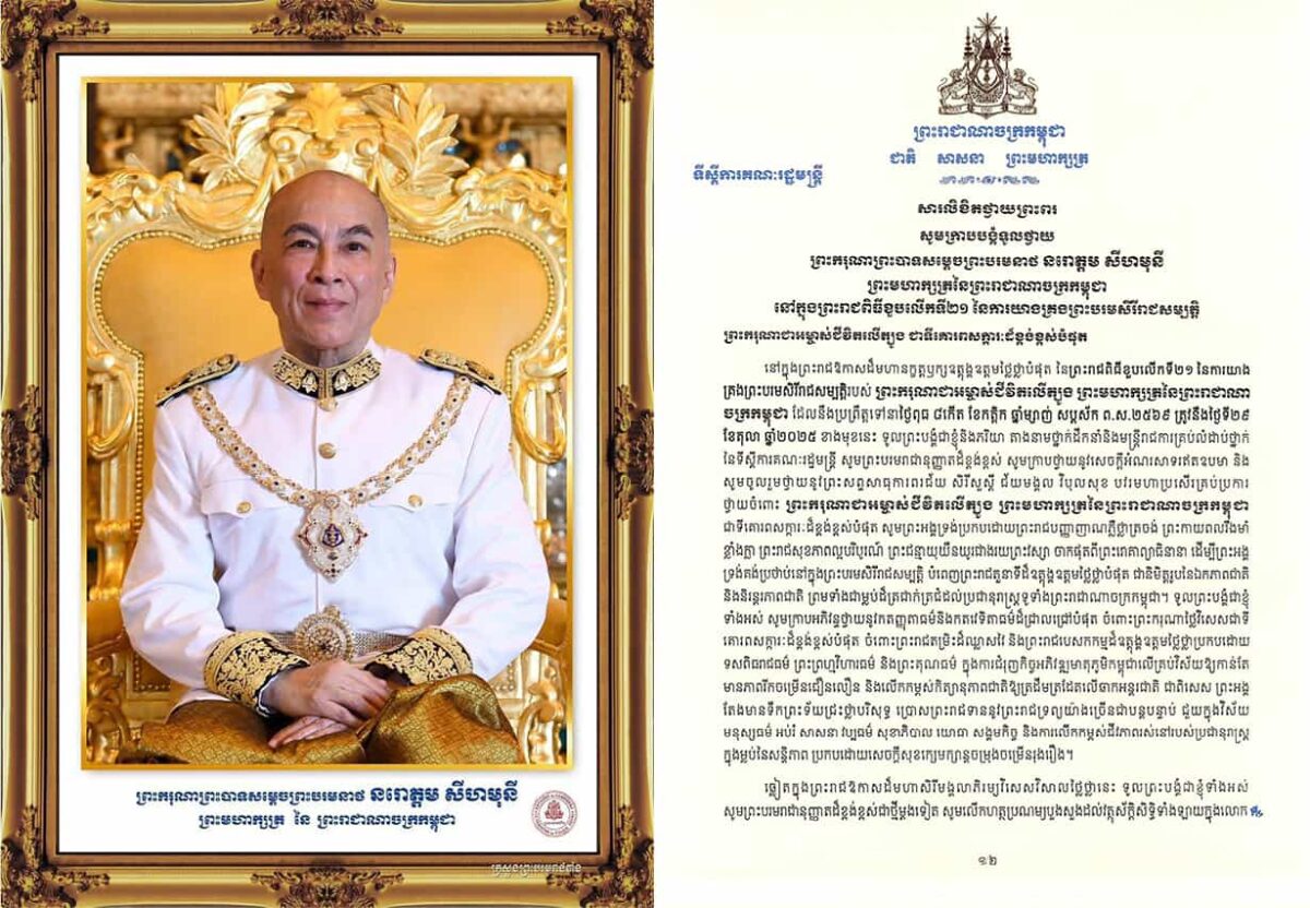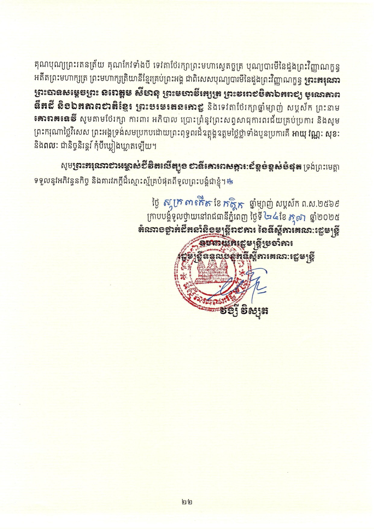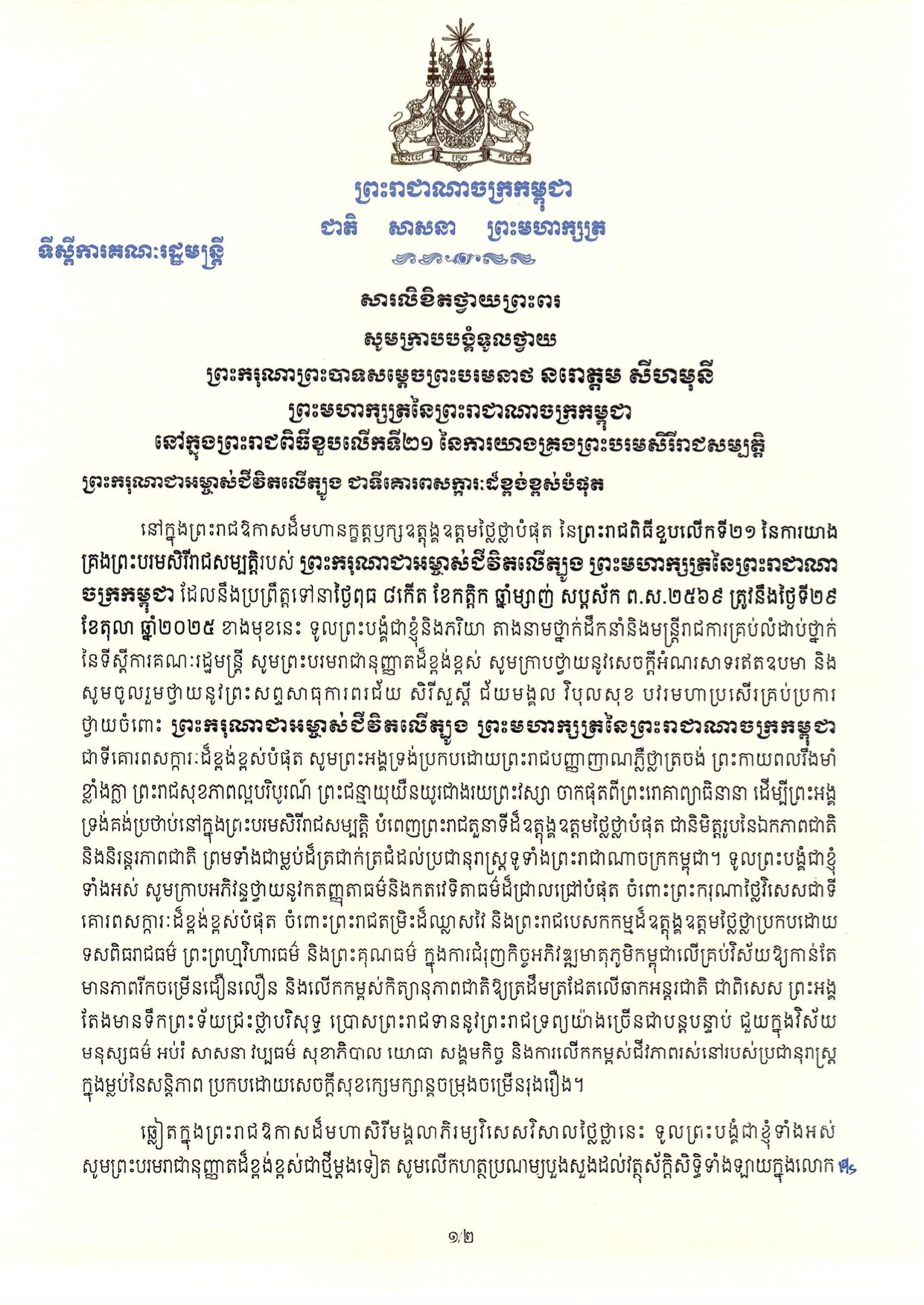 សារលិខិតថ្វាយព្រះពរ សូមក្រាបបង្គំទូលថ្វាយ ព្រះករុណាព្រះបាទសម្តេចព្រះបរមនាថ នរោត្តម សីហមុនី ព្រះមហាក្សត្រនៃព្រះរាជាណាចក្រកម្ពុជា នៅក្នុងព្រះរាជពិធីខួបលើកទី២១ នៃការយាងគ្រងព្រះបរមសិរីរាជសម្បត្តិ