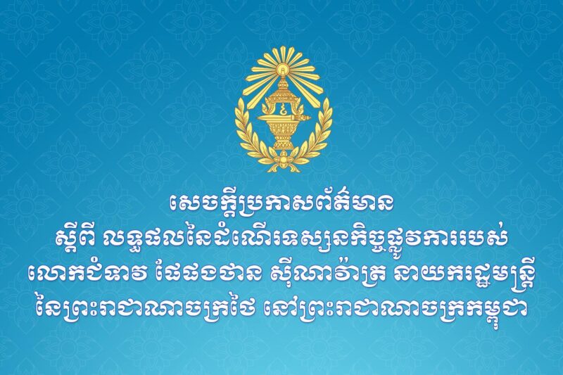 សេចក្តីប្រកាសព័ត៌មាន ស្តីពី លទ្ធផលនៃដំណើរទស្សនកិច្ចផ្លូវការរបស់ លោកជំទាវ ផែផងថាន ស៊ីណាវ៉ាត្រ នាយករដ្ឋមន្ត្រី នៃព្រះរាជាណាចក្រថៃ នៅព្រះរាជាណាចក្រកម្ពុជា