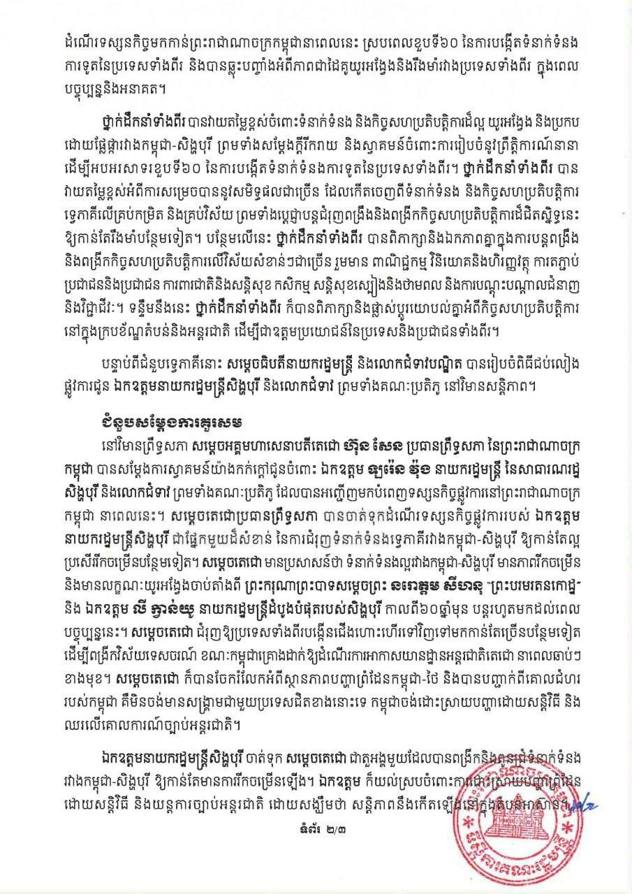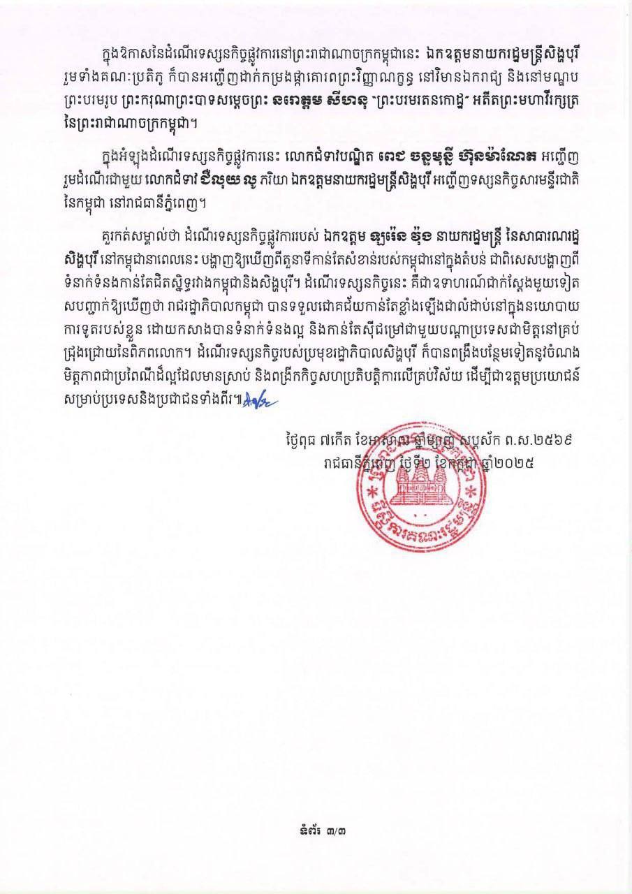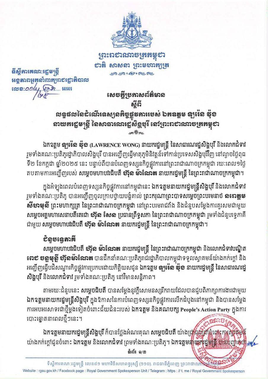 សេចក្តីប្រកាសព័ត៌មានស្តីពីលទ្ធផលនៃដំណើរទស្សនកិច្ចផ្លូវការរបស់ ឯកឧត្តម ឡរ៉េន វ៉ុង នាយករដ្ឋមន្ត្រី នៃសាធារណរដ្ឋសិង្ហបុរី នៅព្រះរាជាណាចក្រកម្ពុជា